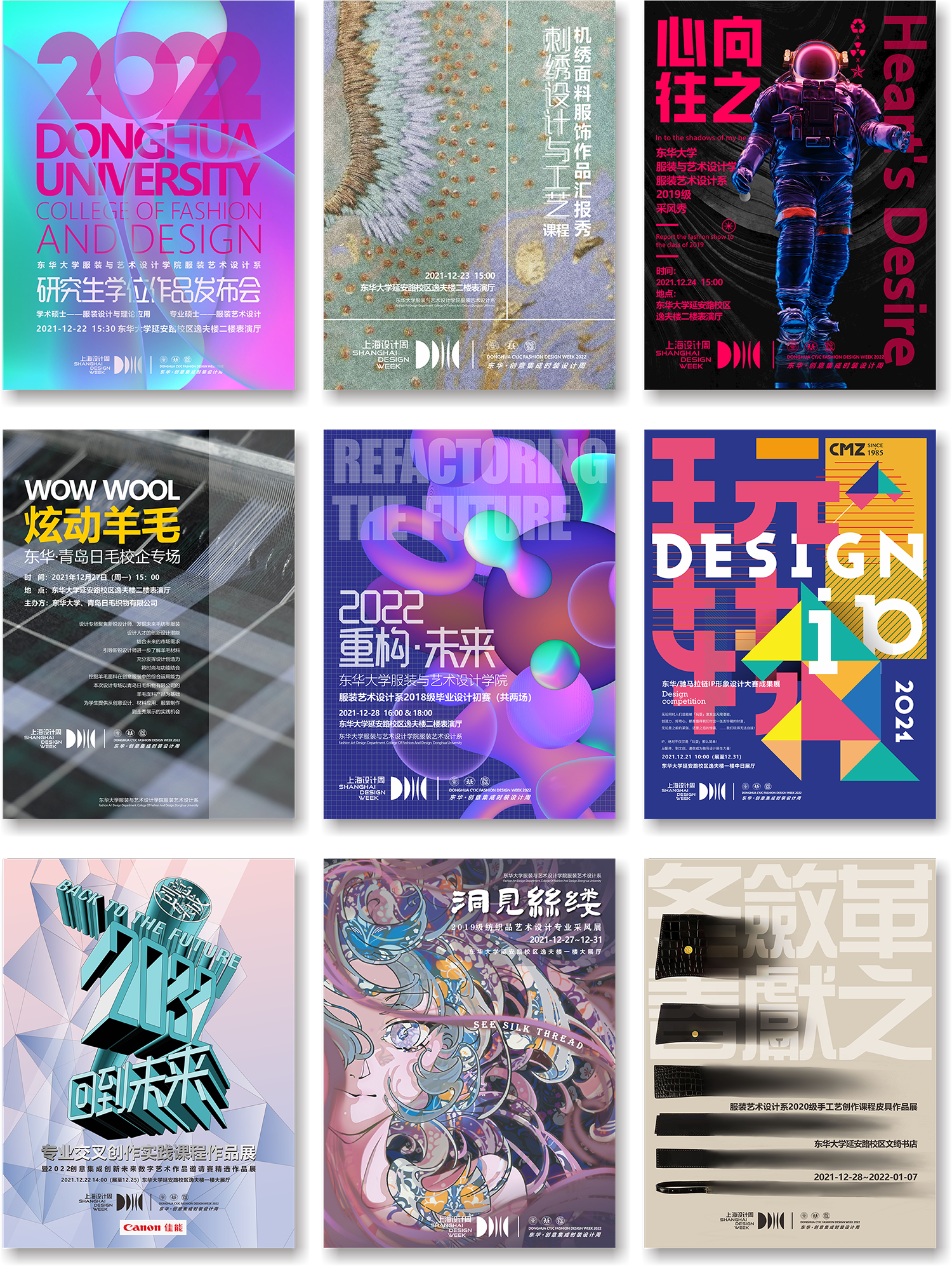 20211221日至1231日,91官网 服装艺术设计系为主导顺利举办了为期10天的校内年度教学交流活动——“东华·创意集成时装设计周”。这已经是【创意集成】时装设计周的第六个年头,通过六年的经验积累、不断优化,逐渐成为服装设计专业最为重大的时装年度盛事之一,除每年学院主办的仅毕业班参与的“环东华时尚周”(毕业季)以外,这个活动已经是服装与服饰设计专业在校学生最为重要的作品展示舞台,从最初设定的学生的时装周学生自己办,在节约经费的整体要求下,简单的舞台、学生自己上台当模特等早期的初级模式,逐渐在学院不断地支持下,向更为专业化的方向发展,今年更是从以往5天的周期增加至10天,从去年增加了专家讲座版块。目前时装周已经基本形成在横向上学生作品动态秀、作品静态展、专家讲座、校企合作成果展多个版块构成的完整体系;在纵向上从二年级、三年级、毕业班、研究生都有对应的场次的展示,从纵横两个维度架构出整个服装设计专业教学成果的直观体现,对学生而言,课程增强了实践环节及目标感,激发学生原创的积极性与荣誉感,并在各年级成果交流中实现了东华文化的沿承与迭代;对于老师而言,有利于封闭式课程授课的开放交流与融合,在各种信息的交流中不断进步,同时也增加导师与学生的互动与精细化指导,为统一思想中的百花齐放奠定基础。