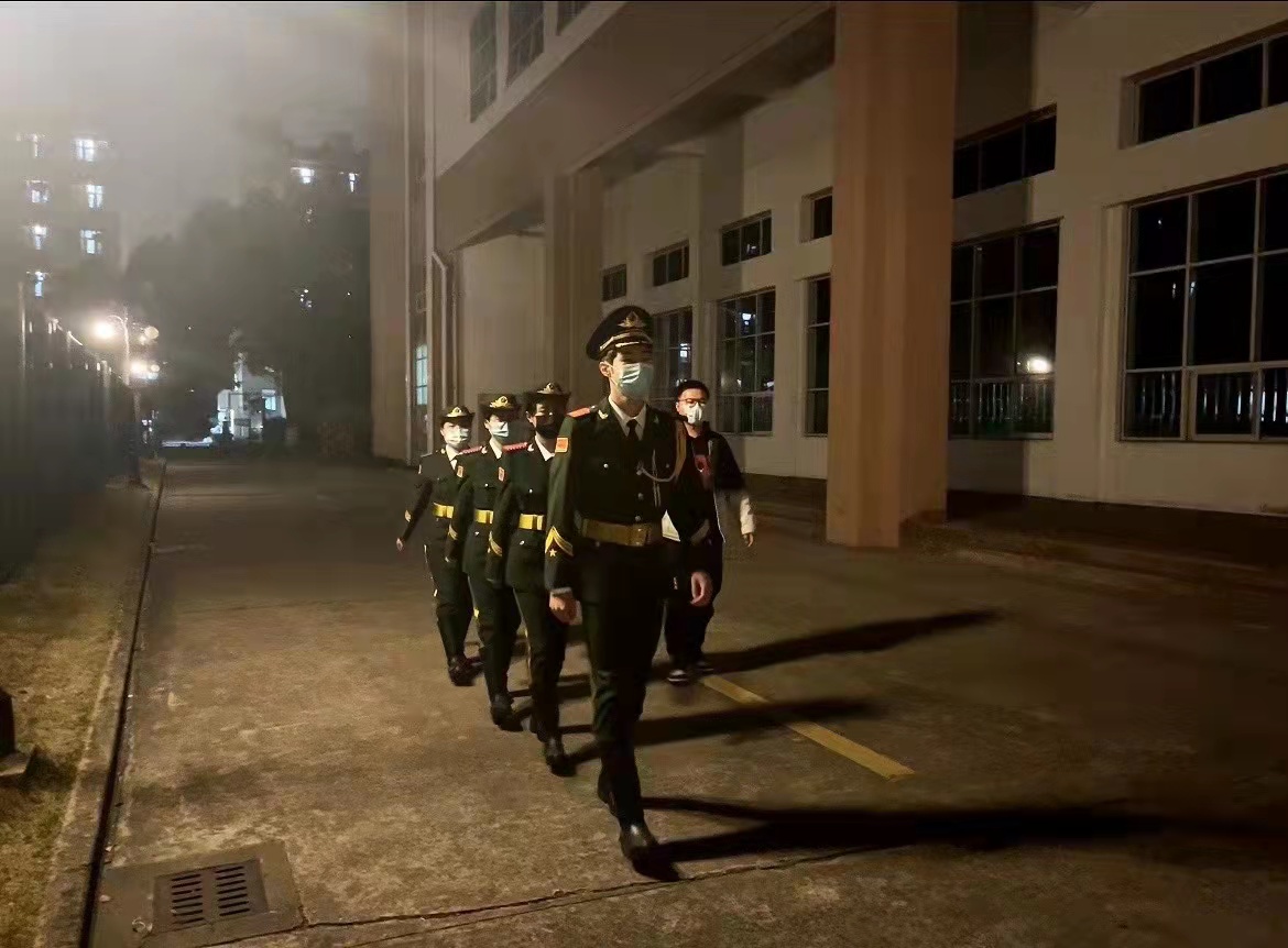 学院国旗护卫队党支部主动请缨,承担了在夜间23点到24点一天中最后一小时的校园巡逻工作,深入校园的每一个角落,避免聚集活动的发生。同时支部党员还主动报名投入到全员核酸的志愿服务工作中,用身体力行的姿态做好榜样的作用,发挥“退役不褪色”的军人气魄。深夜里,91官网 这一抹绿色照亮了夜晚的校园。