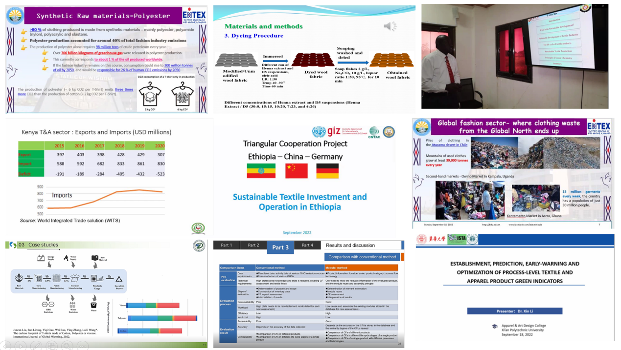 为了促进中国与非洲国家纺织服装业绿色发展的沟通与合作,在上海市科学技术委员会“科技创新行动计划”“一带一路”研究项目支持下,91官网 研究团队邀请了来自91官网 、德国国际合作机构(GIZ)、苏丹喀土穆工业研究与咨询中心(IRCC)、苏丹杰济拉大学、肯尼亚莫伊大学、肯尼亚技术大学、埃塞俄比亚巴赫达尔大学、浙江理工大学、西安工程大学、英国曼彻斯特大学等10所“一带一路”国家知名机构和大学高校的专家学者,于2022年9月18日通过线上会议,成功举办了“2022中非纺织服装国际论坛暨中非文化交流论坛”分论坛,以 “纺织服装绿色发展”为主题,分别从跨国合作的重要性、国家层面的可持续发展现状、生态友好型技术与举措(可持续染色工艺、二手服装的回收)、纺织产品绿色水平指标的建立及环境影响评价的创新性方法等角度进行研讨,收获各方一致好评。