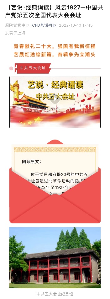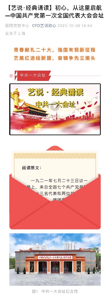 纵观党的历史,党的代表大会在党的成立与发展进程中发挥了重大历史作用,党代会会址则像无声的史册,承载着革命的历史和信仰的力量。国庆期间,本科生党支部组织深入学习,《艺说·经典诵读》开设专栏重温中国共产党历次全国代表大会的会址,重温来时路,奋进新征程。