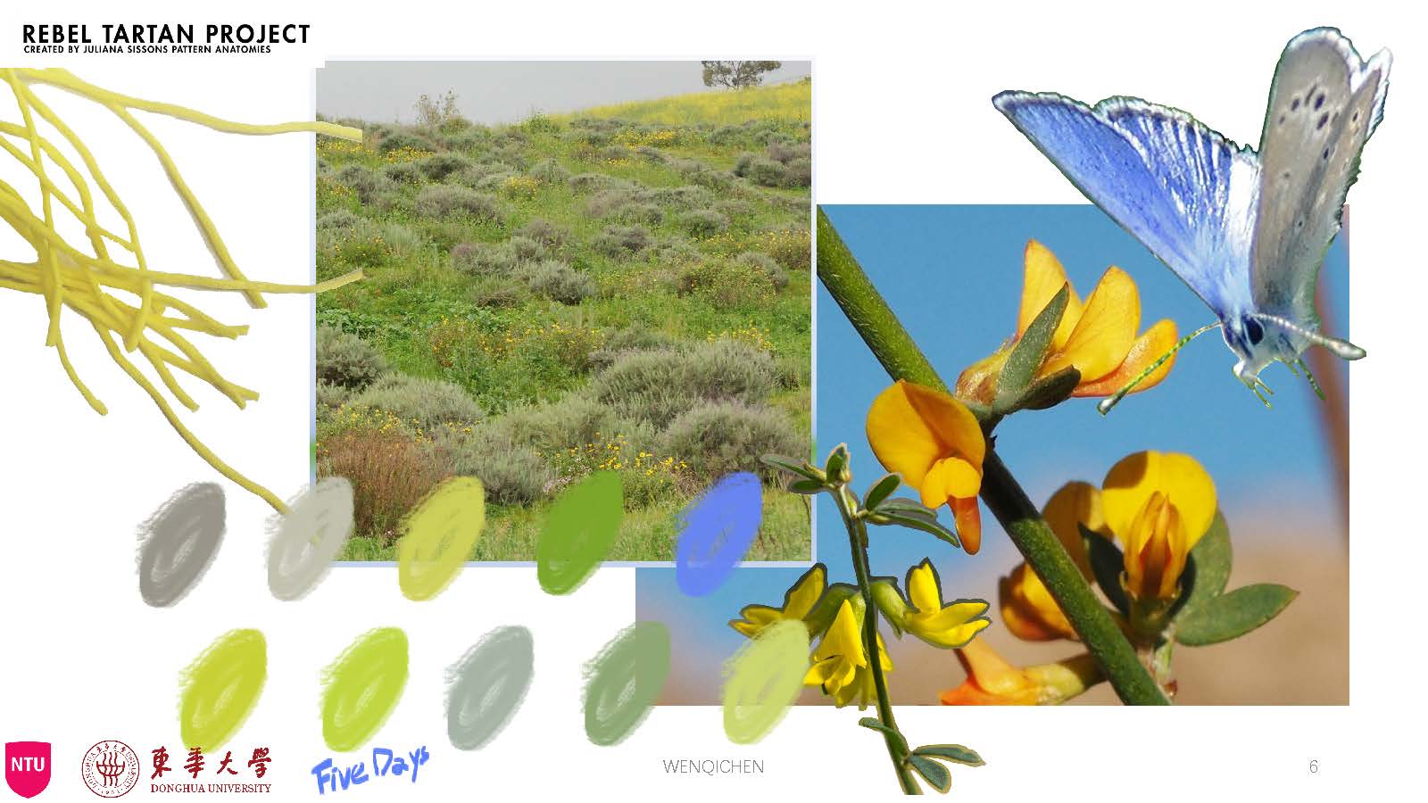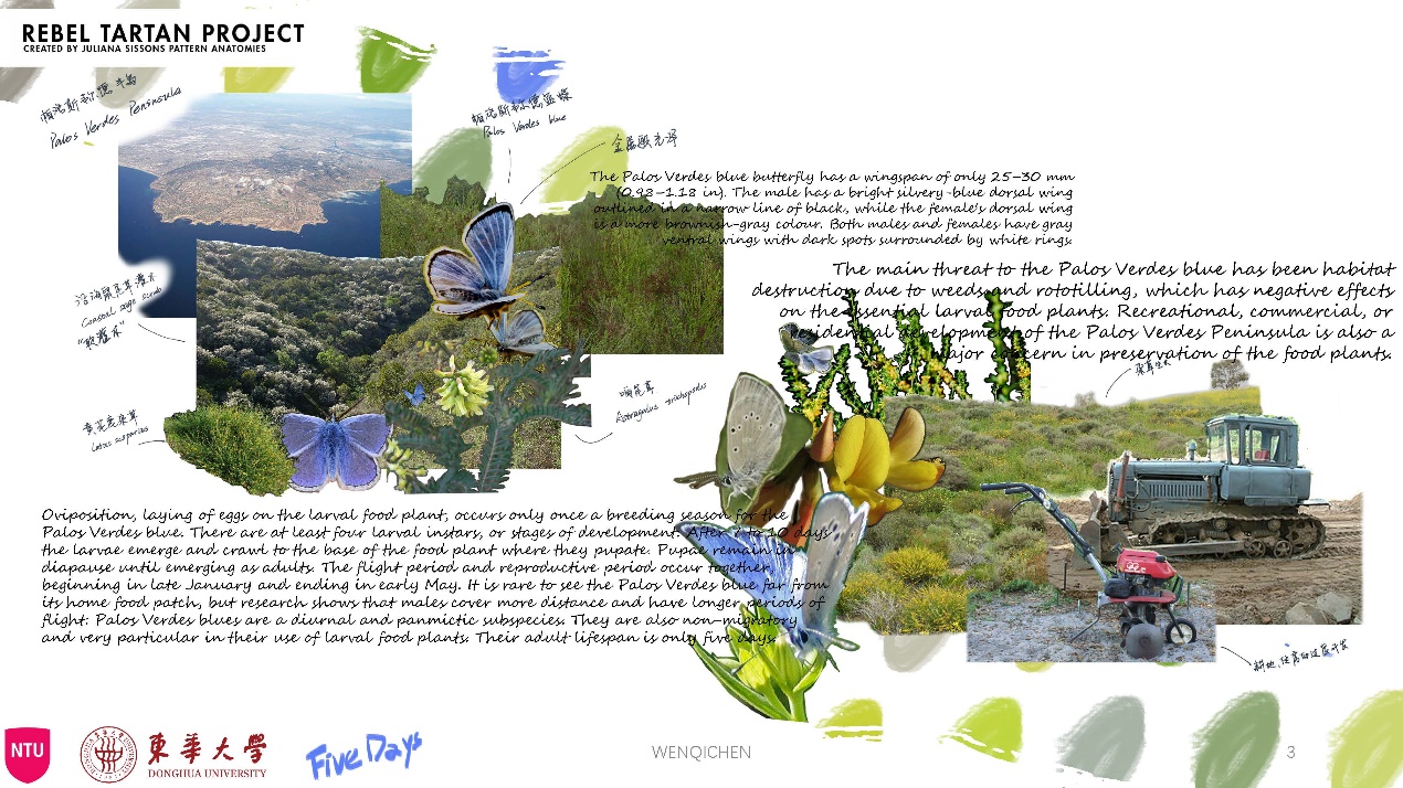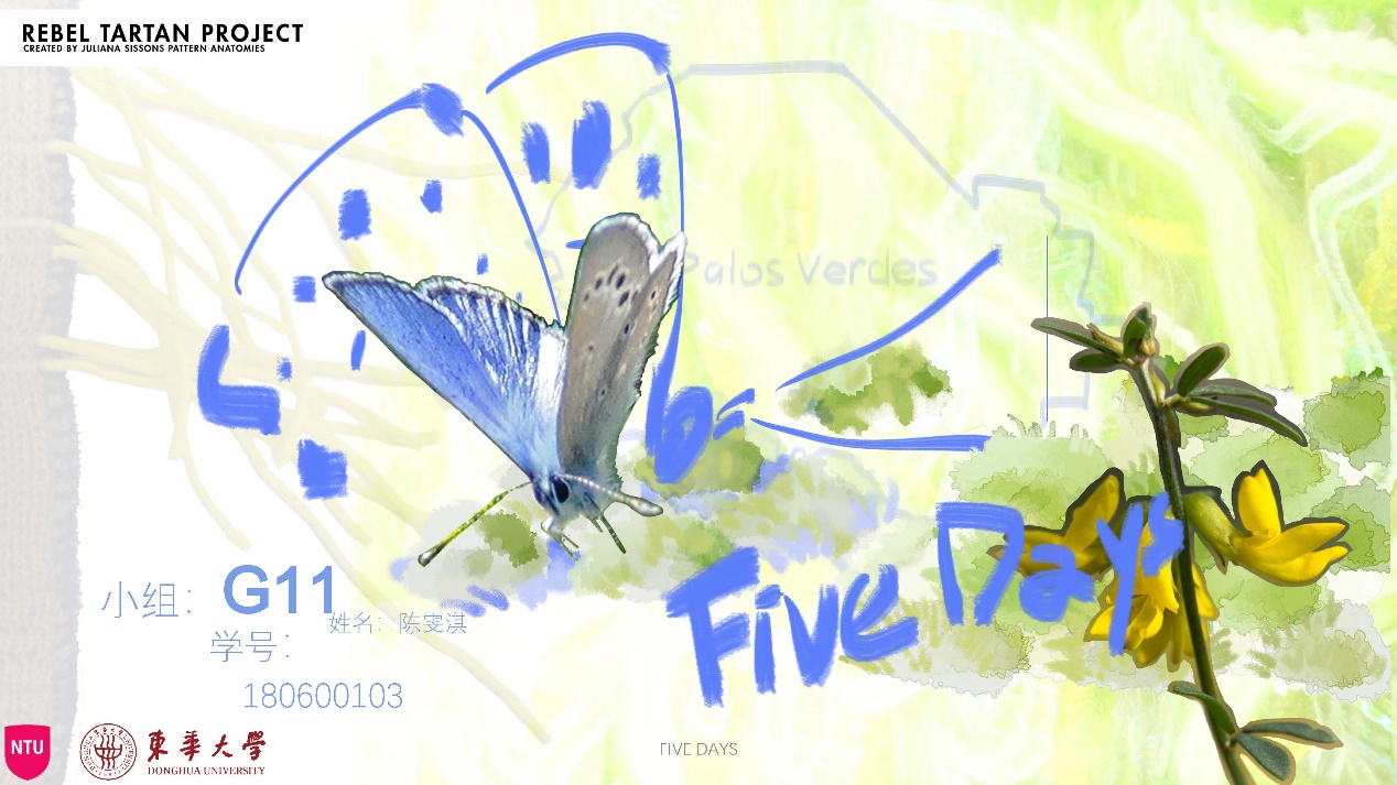 作品理念:全球暖化带来了物种的迁移和灭绝,小组围绕动物福利以“15-life on land”为主题,我们各自从一种陆生生物的角度从探讨气候变化与可持续的一系列相关问题。由于蝴蝶是对气候变化感知最为敏感的昆虫,我选择了曾经一度被认为已经灭绝的帕洛斯韦尔德蓝蝶作为我这一次项目探讨的生命。它们成蝶时间短暂却美丽,因此我发散并确定了自己的主题“5Days”。希望通过作品“5Days”使看到的人们发现这一美丽的生命,感受其美好,关注气候变化带来的不良影响,增加对可持续的思考,并能从身边小事入手促进可持续的发展。
