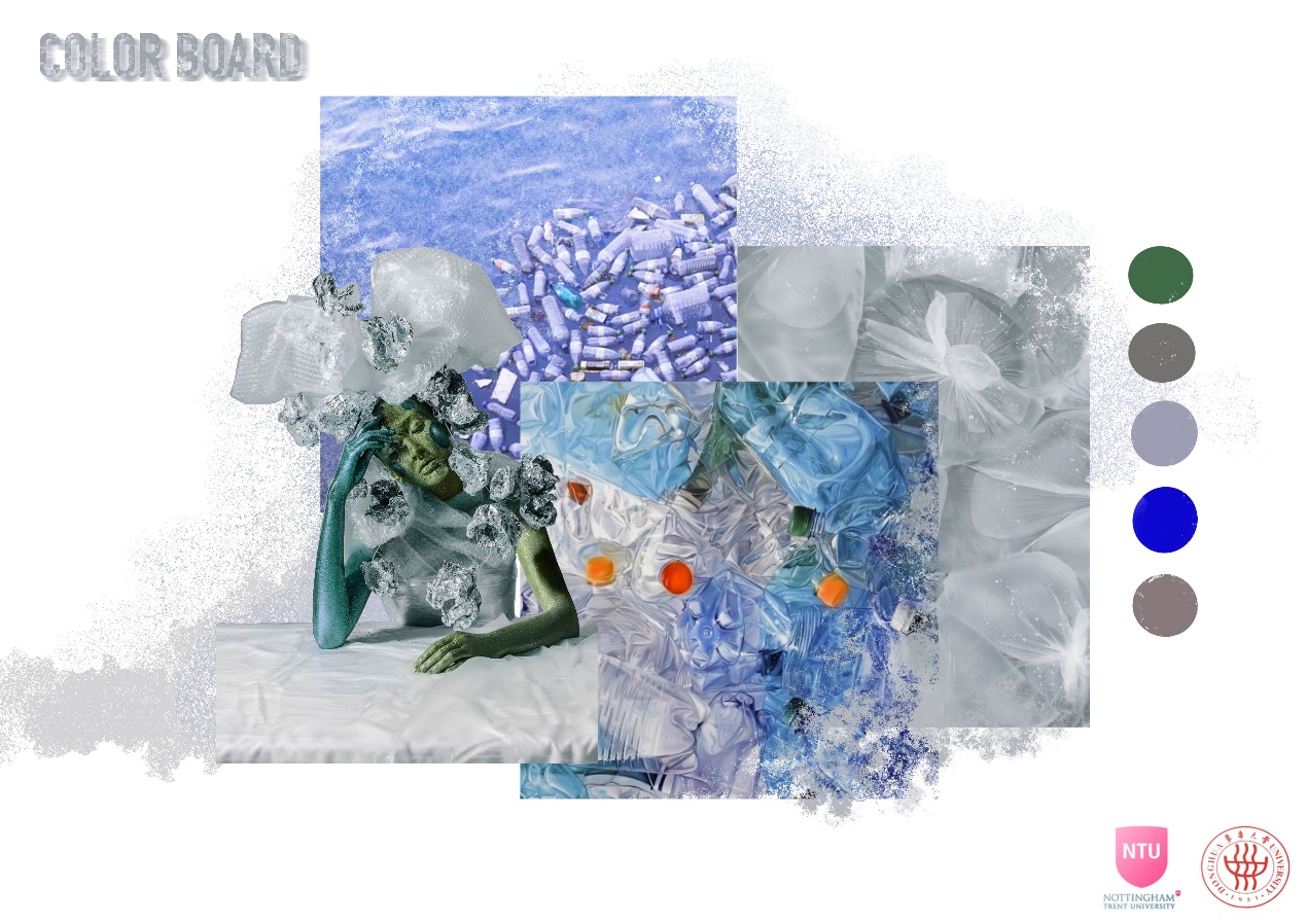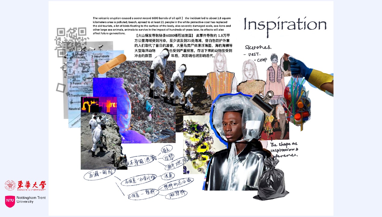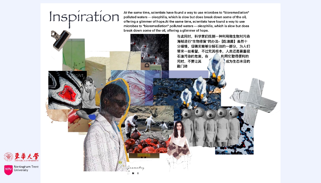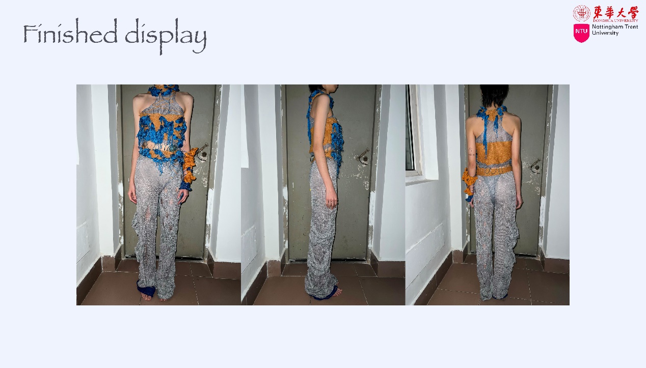 作品理念:在上衣的设计中,将海洋蓝与灰橙色相结合,模拟了一种石油污染海洋的生态环境,用透明鱼线的编织将领口与衣身相连接。下装的阔腿裤我采用了不对称的设计手法,营造一种破碎的美感。我关注到了石油泄漏对海洋环境造成污染的事件。我希望通过对材料的二次改造可以呼吁更多人尝试将海洋污染物“变废为宝”,将环保理念落实到实际行动中来。