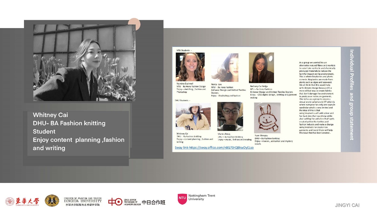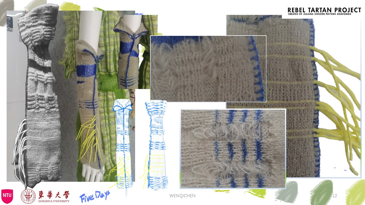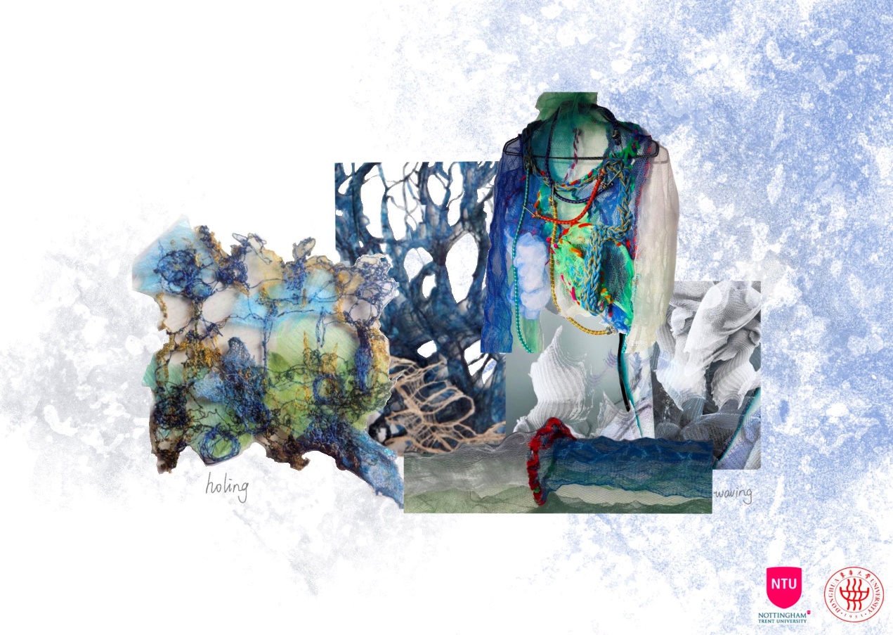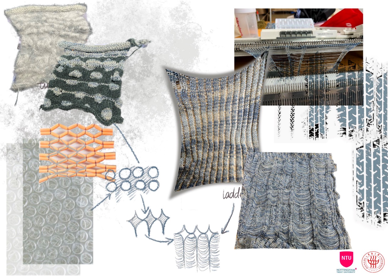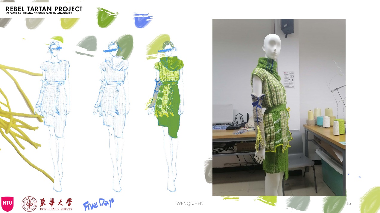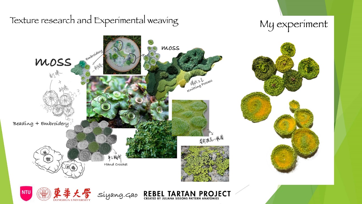 第一模块,依托诺丁汉特伦特大学(Nottingham Trent University,NTU)艺术与设计学院的Rebel Tartan项目,我系部学生与NTU的学生组队,分8组,开展以气候变化为关注点的可持续针织服装主题调研与设计,并完成小组和个人的创意及开发阶段线上汇报。