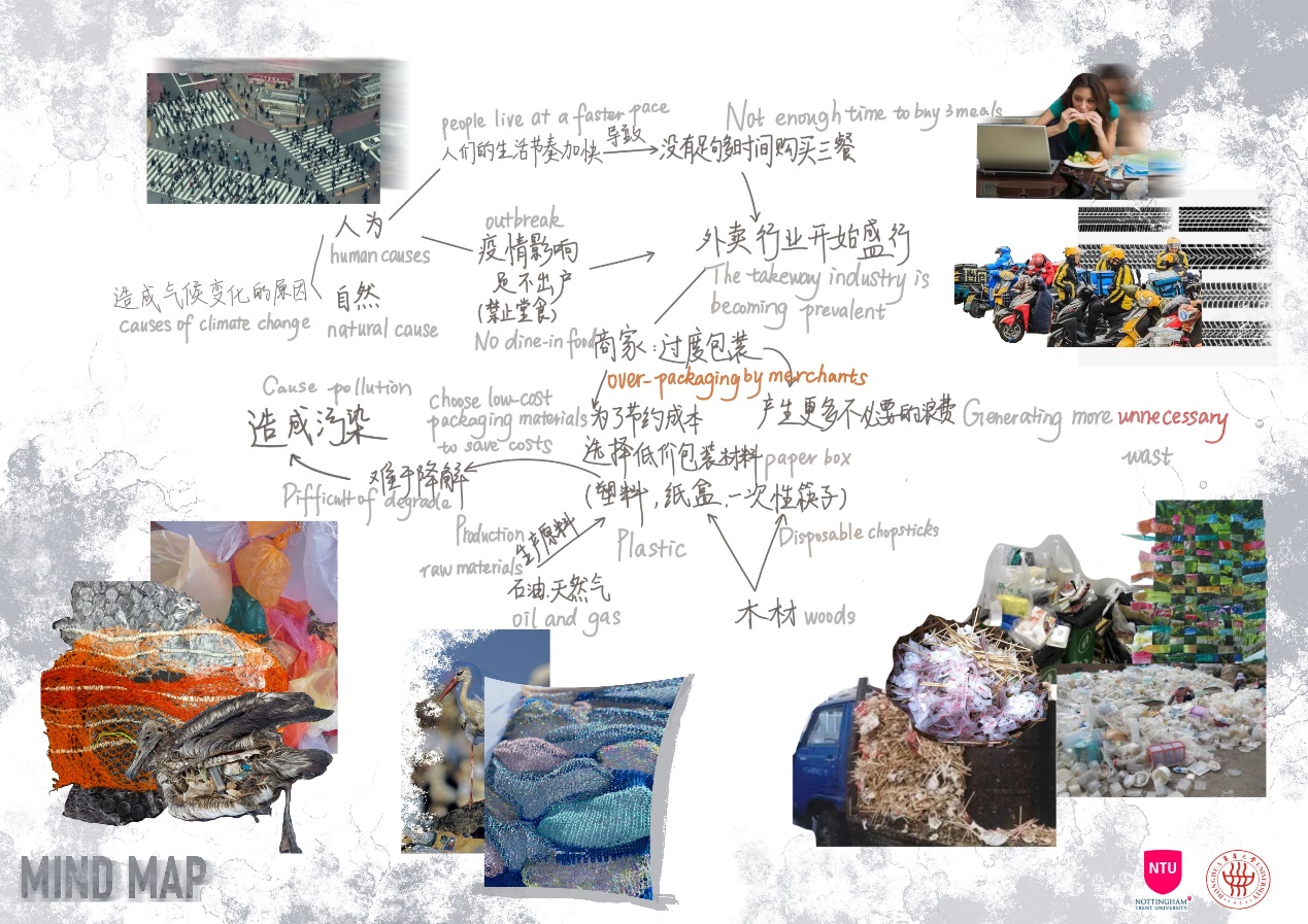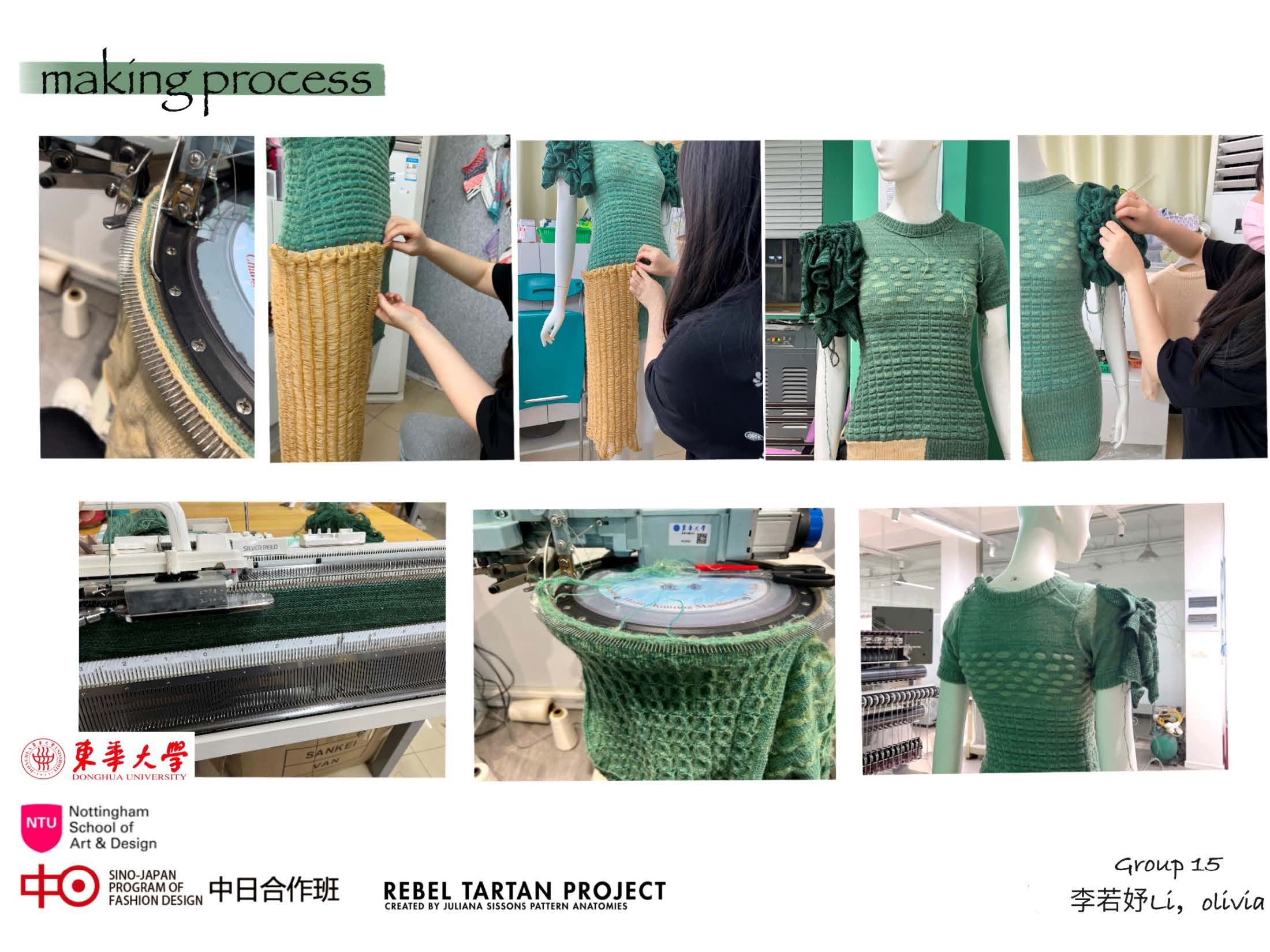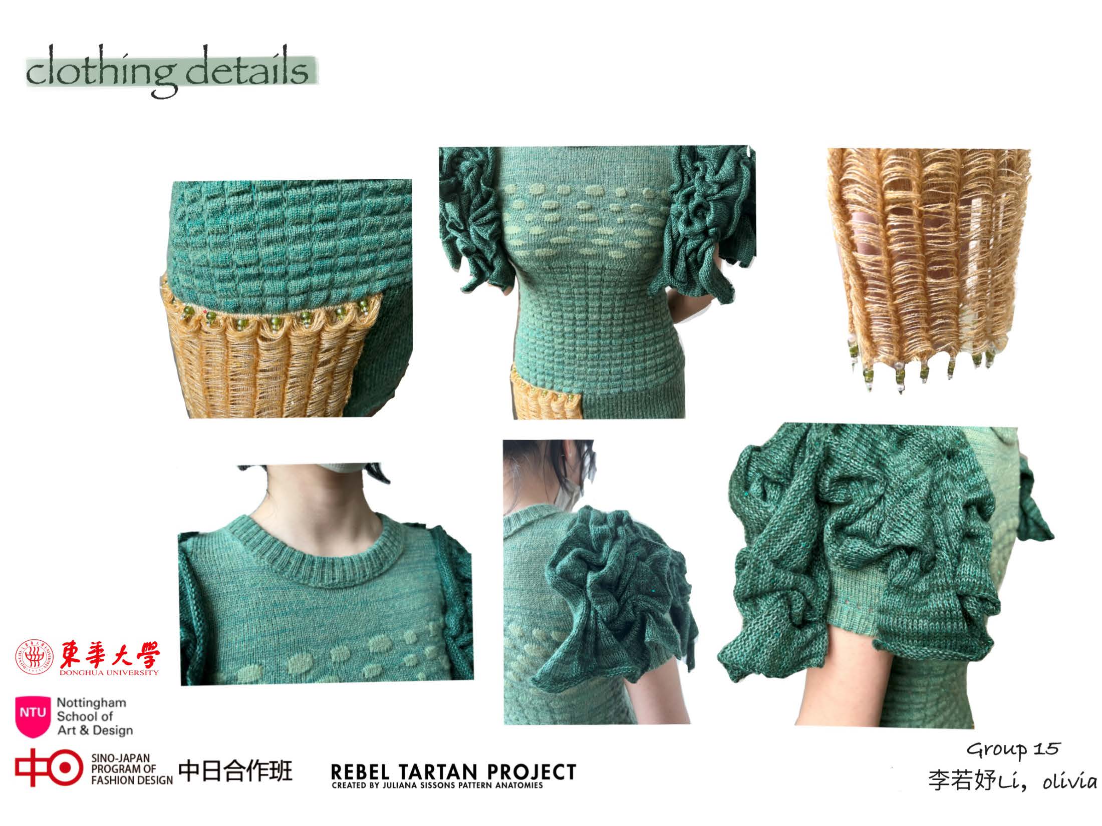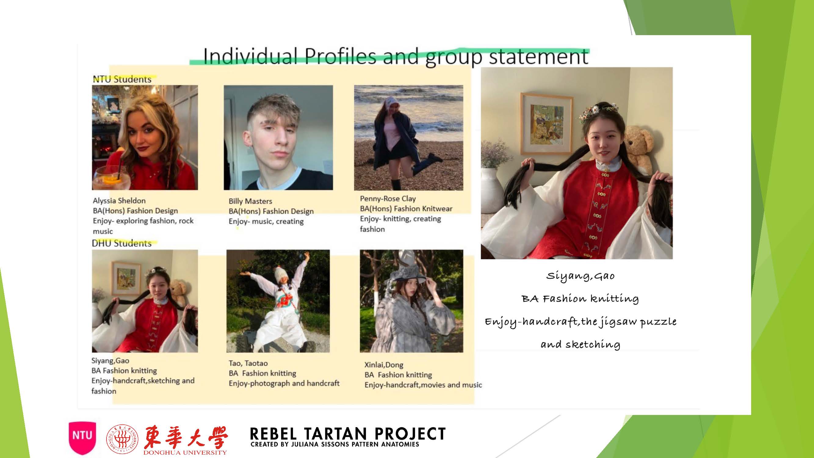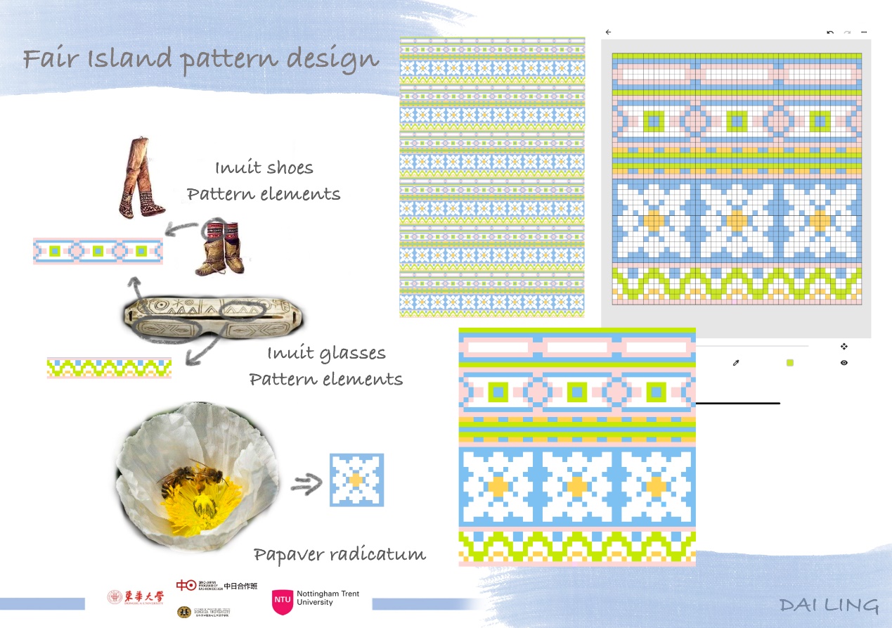 第一模块,依托诺丁汉特伦特大学(Nottingham Trent University,NTU)艺术与设计学院的Rebel Tartan项目,我系部学生与NTU的学生组队,分8组,开展以气候变化为关注点的可持续针织服装主题调研与设计,并完成小组和个人的创意及开发阶段线上汇报。