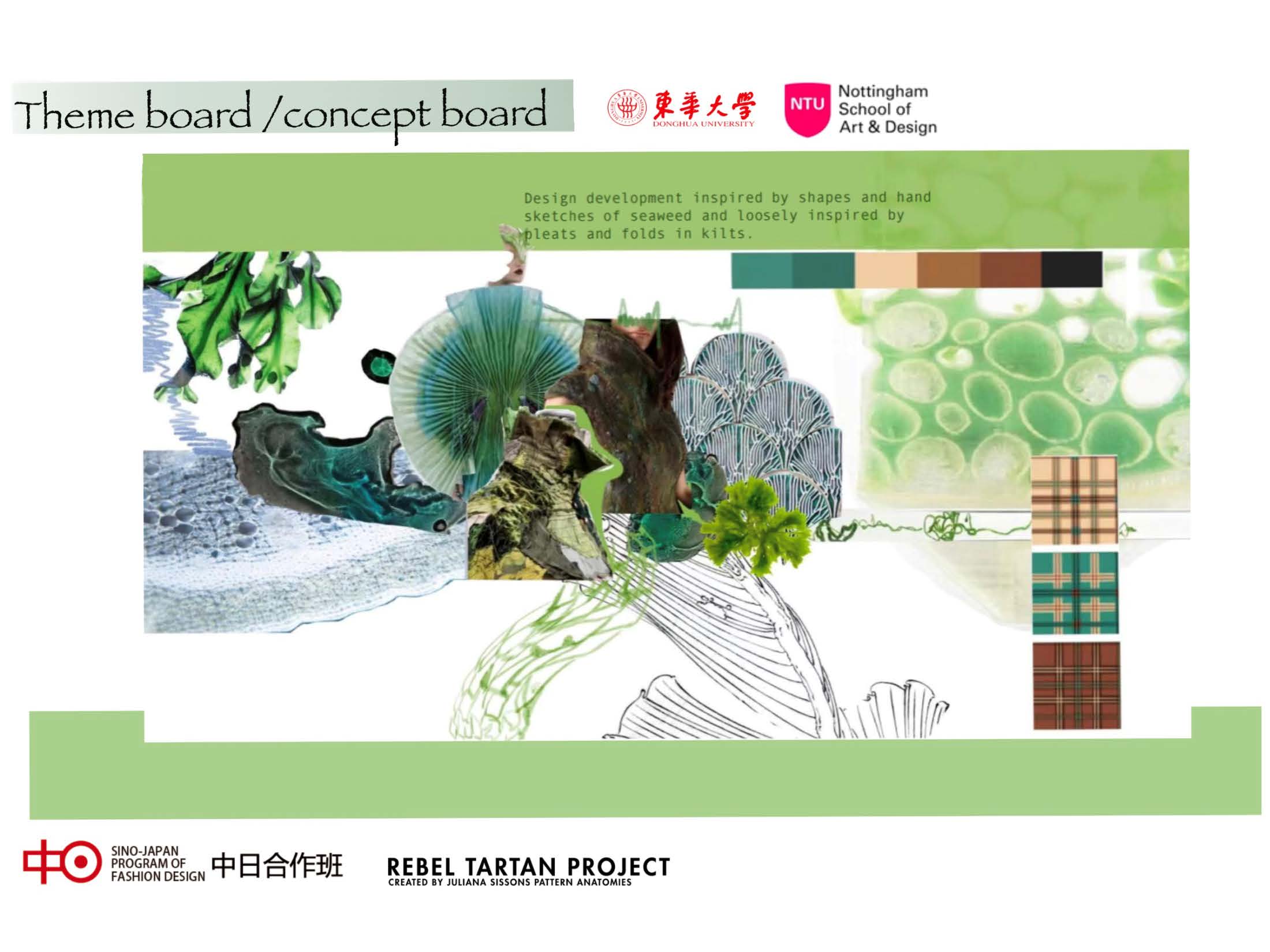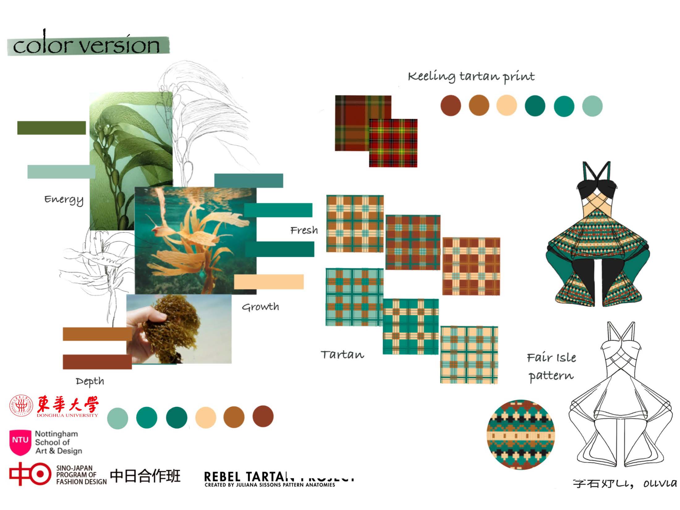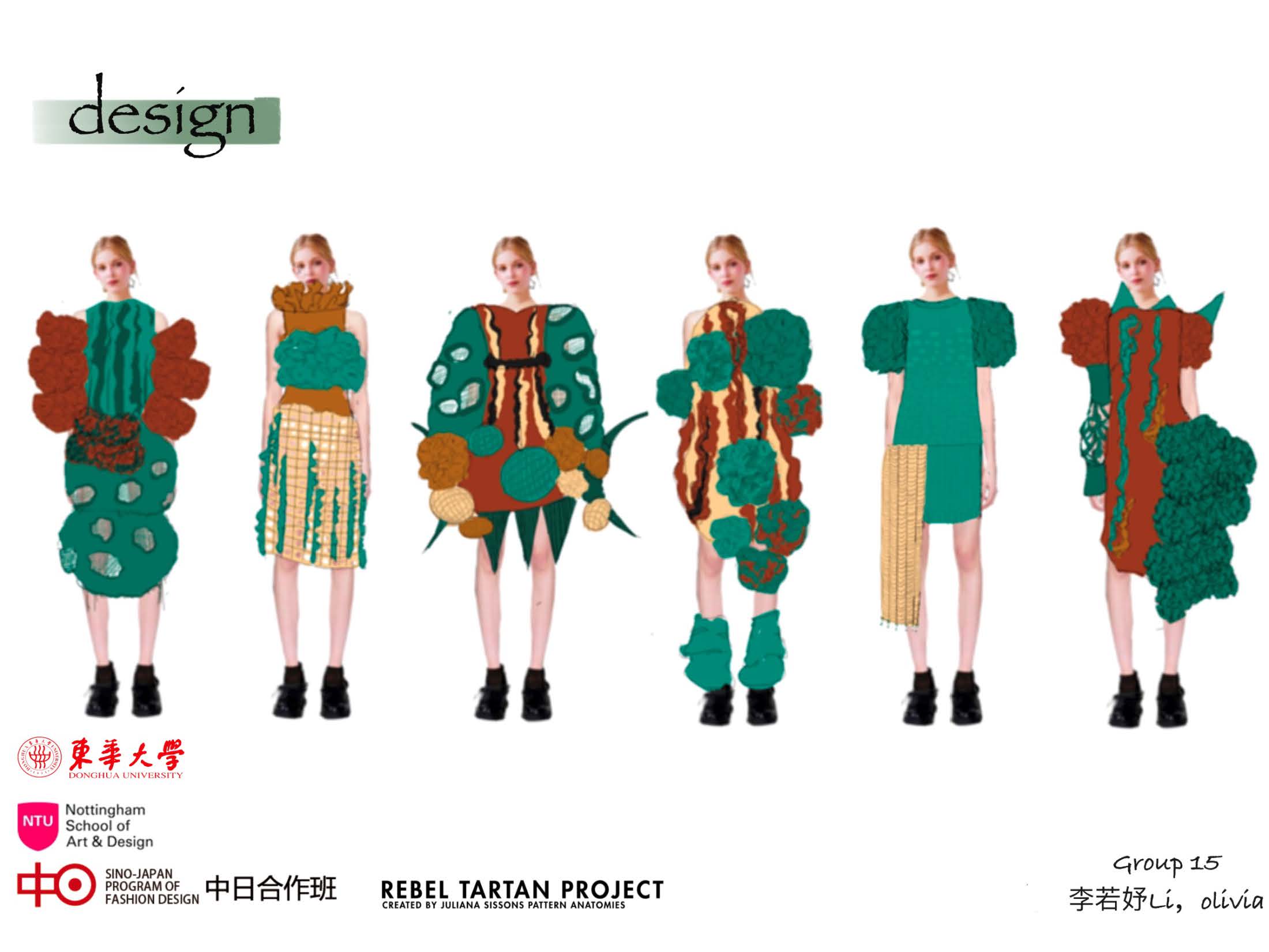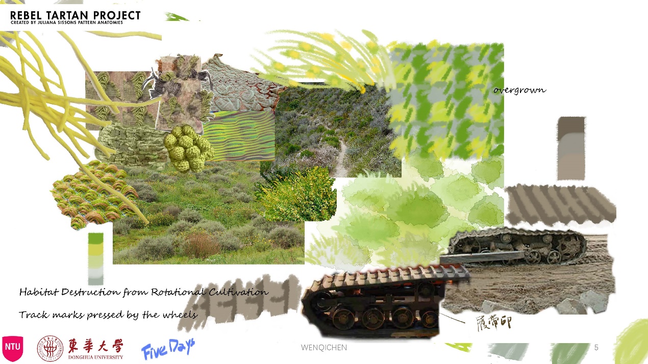 第一模块,依托诺丁汉特伦特大学(Nottingham Trent University,NTU)艺术与设计学院的Rebel Tartan项目,我系部学生与NTU的学生组队,分8组,开展以气候变化为关注点的可持续针织服装主题调研与设计,并完成小组和个人的创意及开发阶段线上汇报。