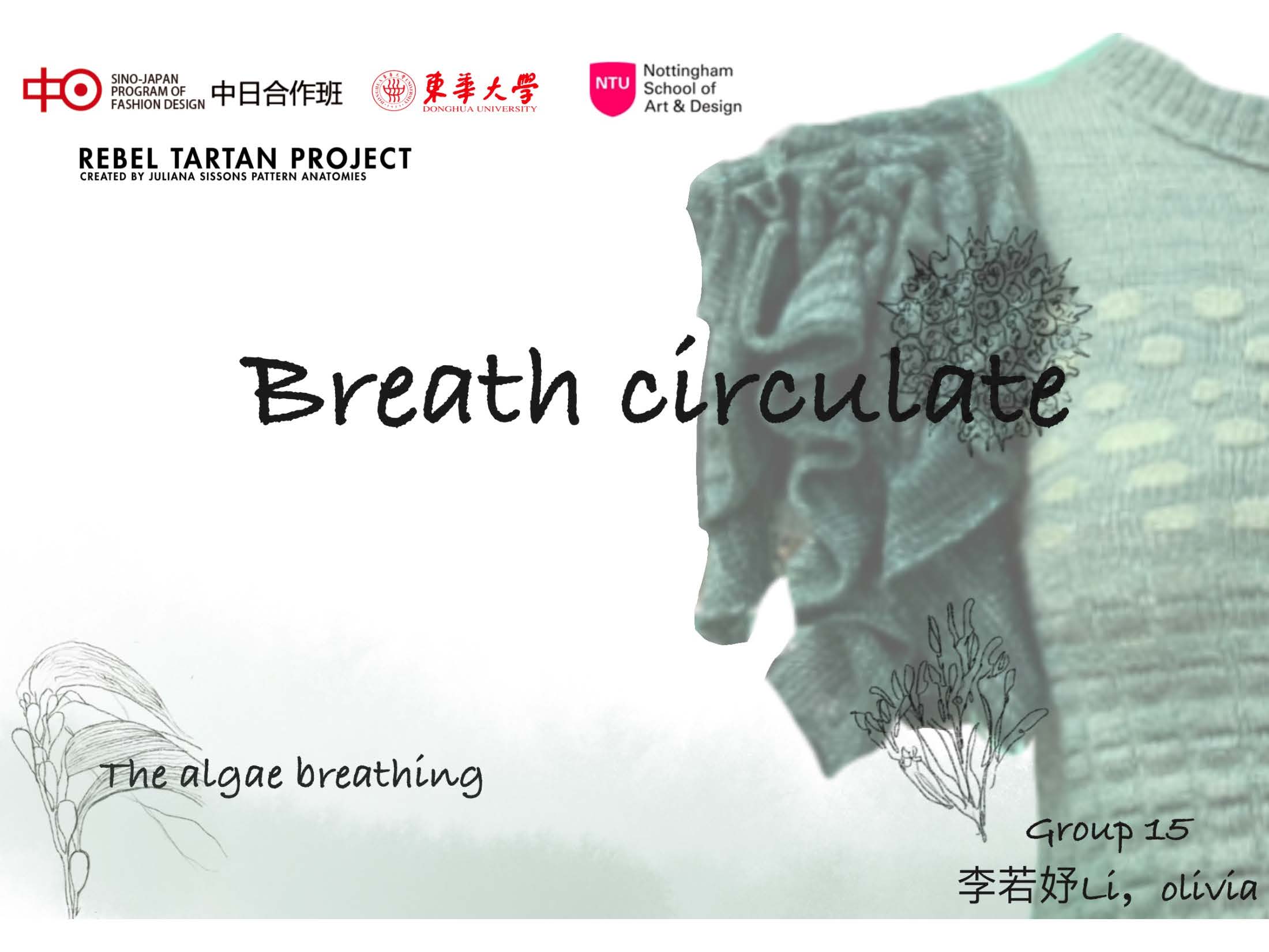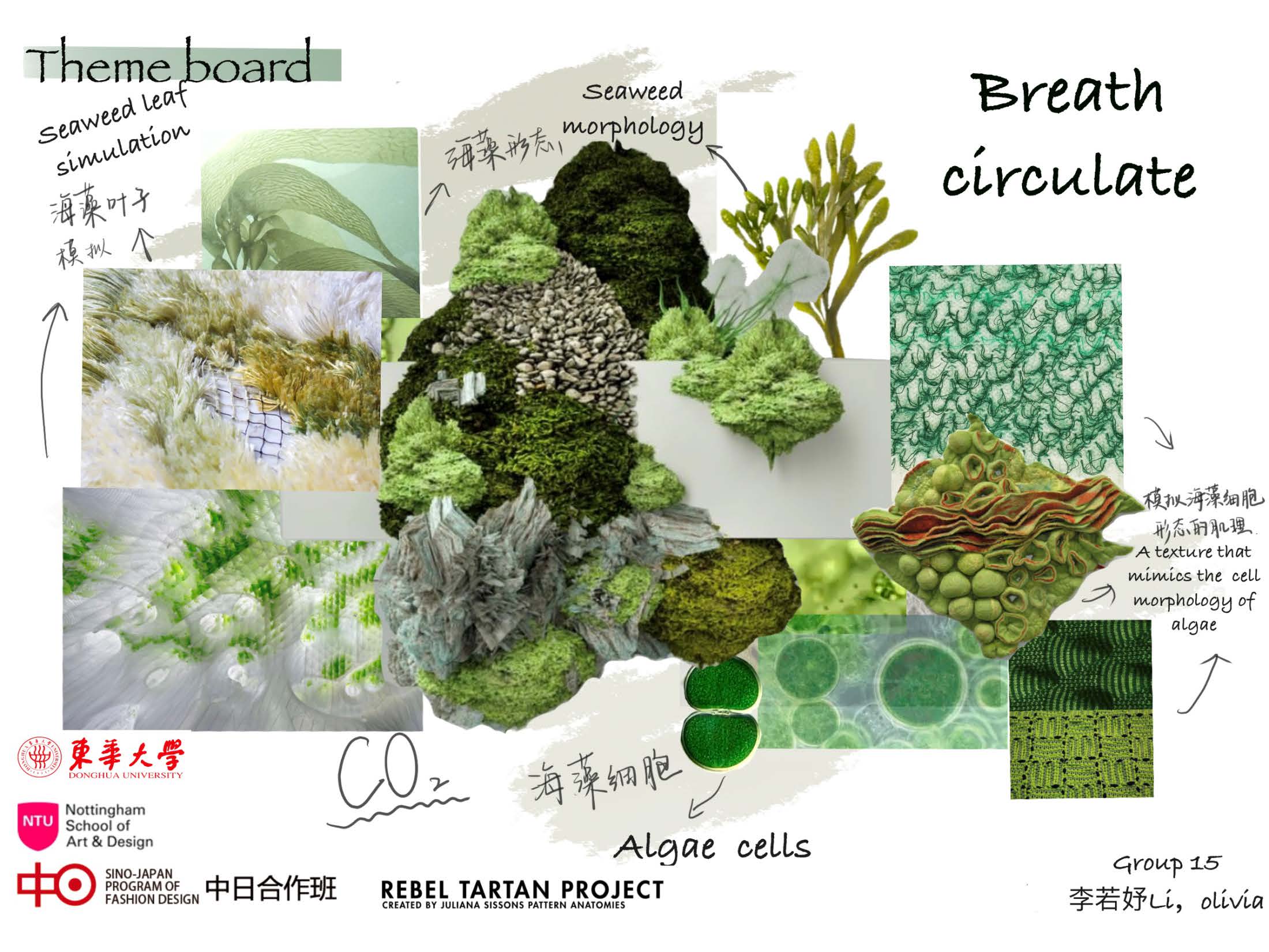 作品理念:通过绿色植物来研究植物呼吸之间的循环关系。本次的具体研究对象为海藻,提取海藻生长期、发育期、死亡期三个生长阶段的色彩,提取不同海藻细胞的形态肌理,主要采用网状结构、木耳边结构、挑洞结构、浮线结构、抽褶结构等来模拟海藻生长状态以及细胞形态,希望通过展现植物的呼吸循环,有利于碳中和,进而呼吁环保与可持续发展。