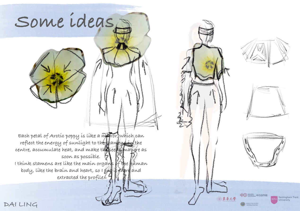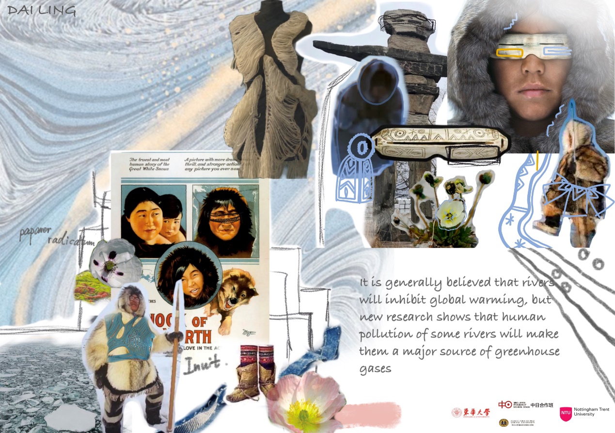 作品理念:因为气候的问题会像被推倒的多米诺骨牌一样,产生一系列连锁反应。气候变化引起的北极生态变化,激发我的主题“adversity life”。灵感来源于北极的北极罂粟和生活在那的因纽特人。北极罂粟的花语是向死而生,它生活在恶劣的环境中,但是对生命充满着热忱,从中提取服装作品中的主要颜色。我希望我的作品可以让人可以想到自然生命的顽强与美妙,关注气候变暖,思考如何更好地可持续发展,保护人们赖以生存的自然环境与资源,让人与自然更加和谐美好。