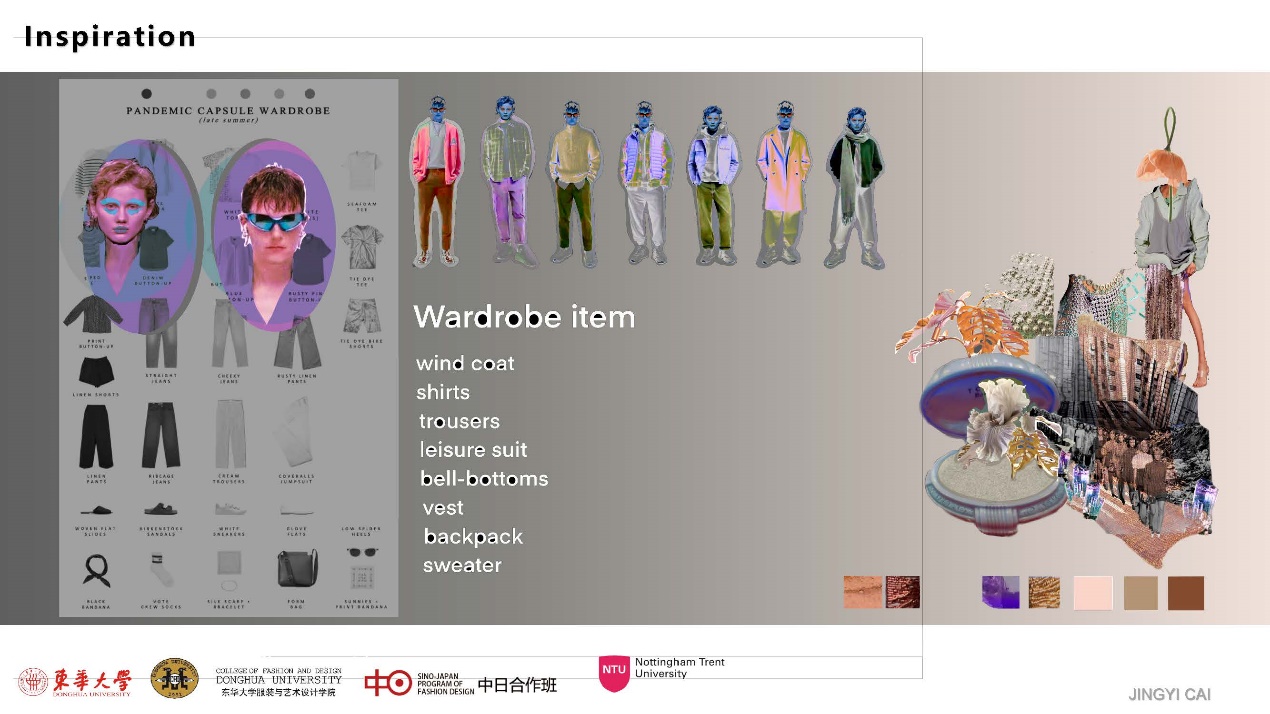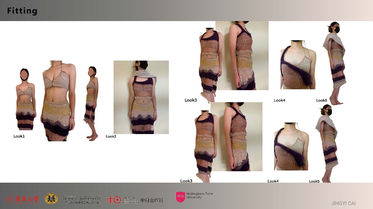 作品理念:基于气候变化和可持续设计,希望使用天然纤维或生物面料来替代合成和化学生产的材料,以减少对环境的有害影响。我们团队创建的37号虚拟世界里,每个人只有一个被限制的胶囊衣服。使用环保生物塑料材质为人们的衣橱增添色彩和乐趣,同时降低污染。我个人的设计则聚焦于第37世界喜欢狂欢派对的年轻人,在胶囊衣橱的限制下,通过针织服装的解构和款式搭配的多样化,拓展服装的穿着场合以及穿法,达到可持续的目的。