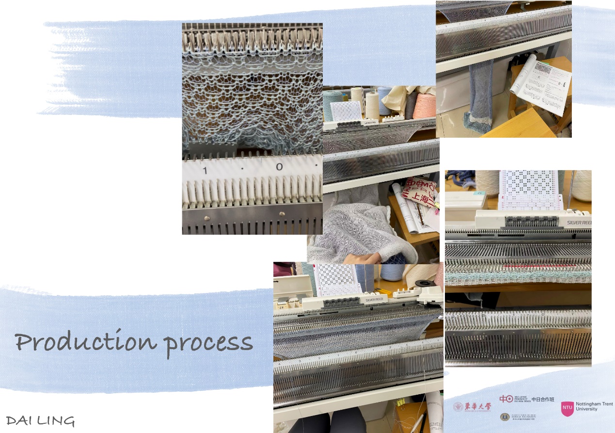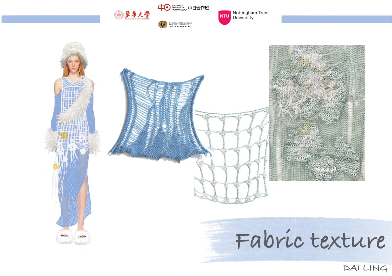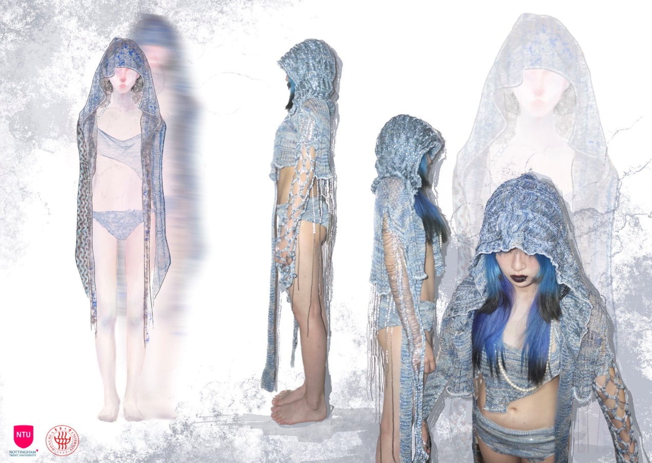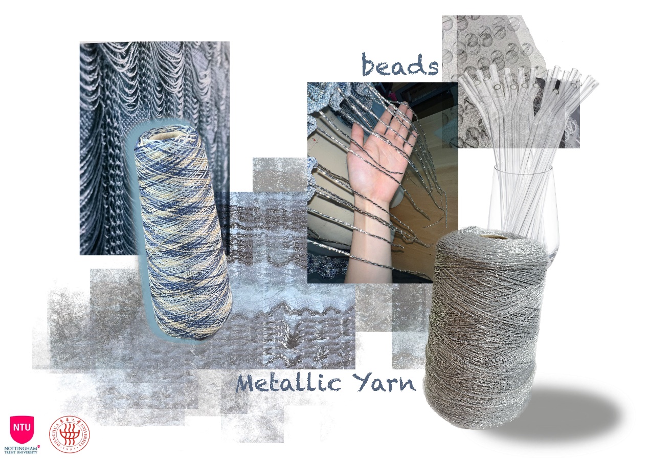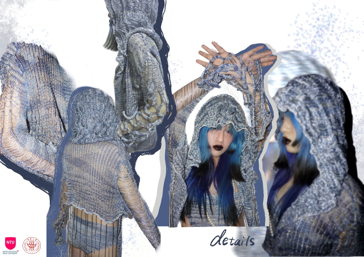 作品理念:呼吁人们重视环境保护和塑料污染。现代生活中,一次性塑料包装材料使用非常多,而一般塑料需要长达100-200年才能自然降解,这就造成了大面积的污染。我关注到以上现象,以此为灵感,选择了金银丝线和段染纱线。用蓝灰段染纱来表现海洋生态环境遭受破坏的情绪;提取了一次性吸管的型,使用管珠作为装饰;突出针织肌理的表达,最终制作成衣。