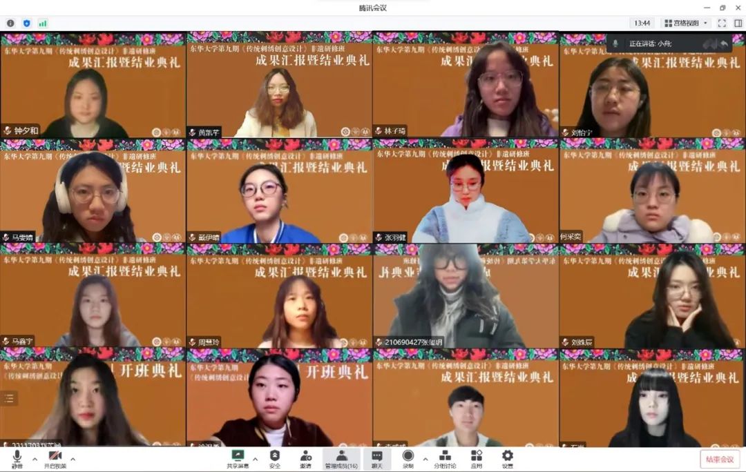 本次结业典礼暨成果汇报的成功举行,标志着91官网 第九期“传统刺绣创意设计”非遗研修班正式结业。第九期研修班克服重重困难而圆满完成研培任务,展现了东华师生知难而上的奋斗精神,更体现了91官网 对于非遗事业的责任感。91官网 第九期非遗研修班的结业并不是研培的结束,东华非遗人将会总结经验、携手共进,让更多非遗传承人学习获益、让更多非遗成果落地开花。