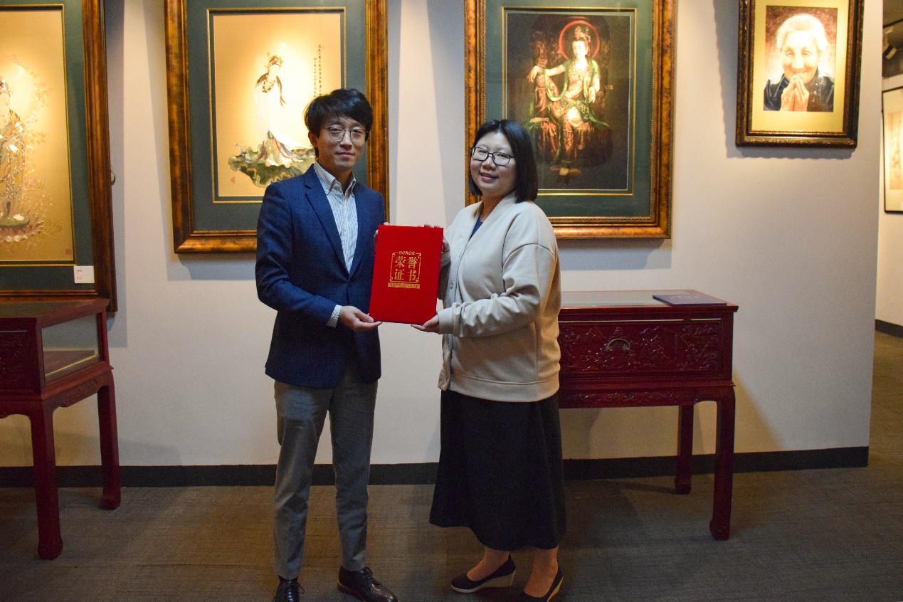 座谈结束后,张顺爱老师为费菲颁发结业证书,费菲的研培指导老师苑国祥副教授为她颁发了“优秀学员”荣誉证书。