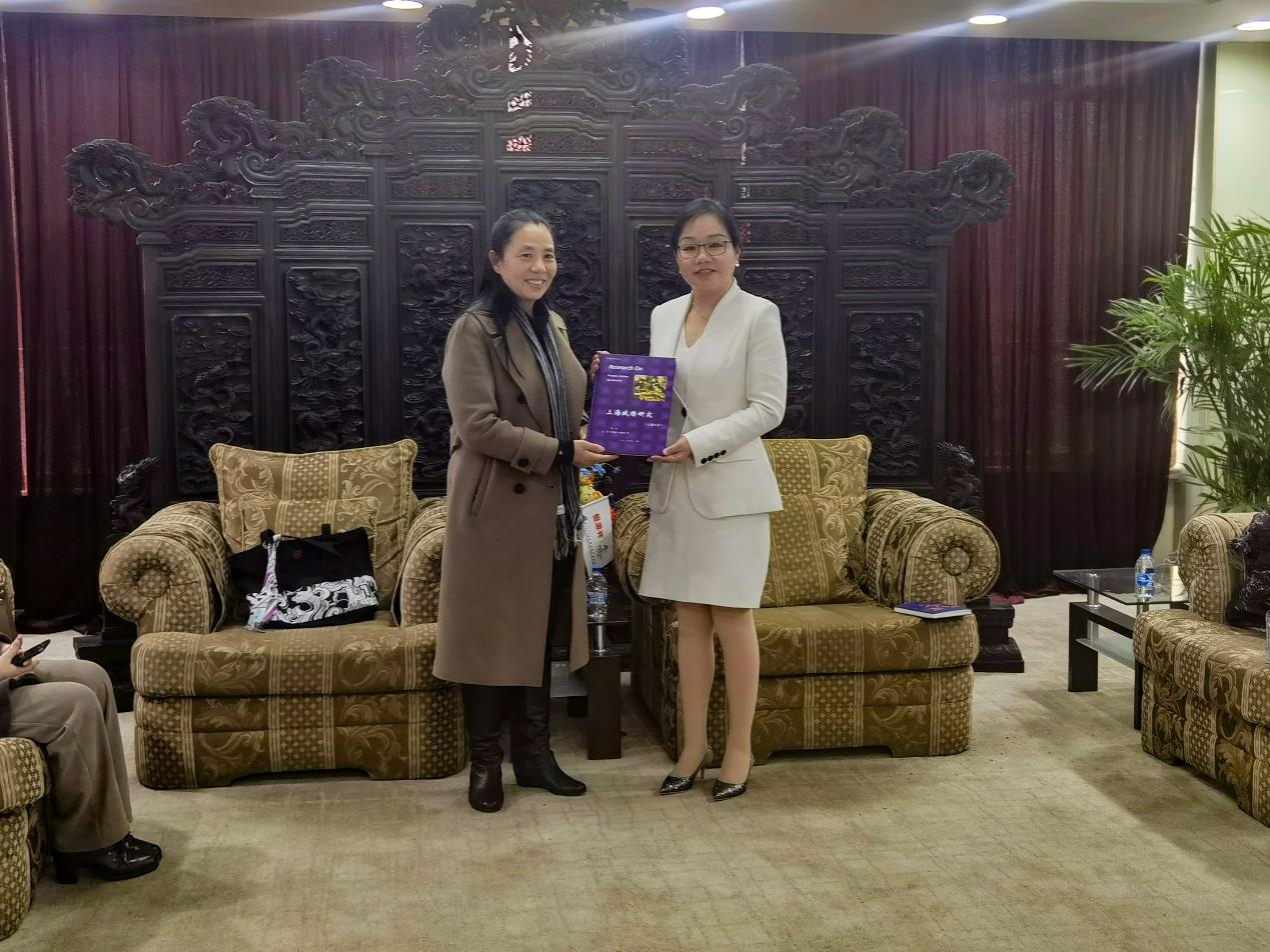 图8 柯玲老师向恒源祥集团赠送《上海绒绣研究》