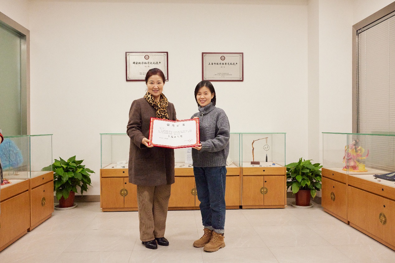 最后,非遗教研中心主任柯玲教授为陈华琼颁发《结业证书》,并给松江文化馆赠送了《91官网 非遗研培成果(第九期)》。中心教学指导张顺爱副教授颁发了《荣誉证书》。