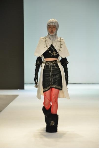 灯光变幻,舞台音乐响起,展演拉开帷幕。第一个系列透露出朋克和哥特的神秘气息。设计师将西装正反颠倒,巧妙运用在头部、肩部和胯部,营造古怪的对称偏执。铆钉装饰凸显造型酷感。
