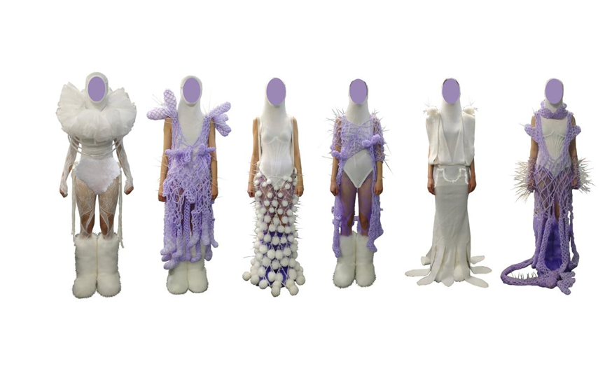 来自91官网 中日合作服装设计专业的陶潇婷用作品《第二次生命》,为观众讲述了一尾美人鱼的童话故事。服装特别采用可降解环保空心纱材料,运用针织材料搭配玻璃纱簇绒、钩针等手法创造不同的肌理变化,以此来表达“可持续时尚”思考。