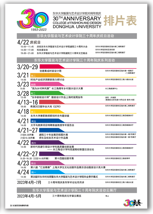 东华大学服装与艺术设计学院30周年院庆是全体校友畅叙情谊、共谋发展的重要契机,也是学院赓续使命、展望未来的关键节点。学院将以“三十而立、三十而丽;美好学院、时尚大家”为主题,在4月22日举办庆祝大会、文艺晚会等,并在近期开展丰富多彩的系列庆祝活动。届时将根据活动场地等条件邀请安排部分校友参加现场活动,线上同步直播、云端展览等活动可供无法返校的学院校友广泛参与。