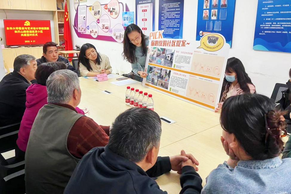 袁姝也将师生团队的设计成果向居民代表汇报展示,包含社区专属IP形象创作、社区导览标识系统设计、社区老旧墙面涂鸦更新、社区便民市集方案展示等方面,从生活环境改造到人文生态营造双线并进,通过开展浸润式、场景式、下沉式、主动式育人形式,将社区作为设计学生锤炼本领的第二课堂,构建高校学生社区育人共同体,打通了育人“最后一公里”。