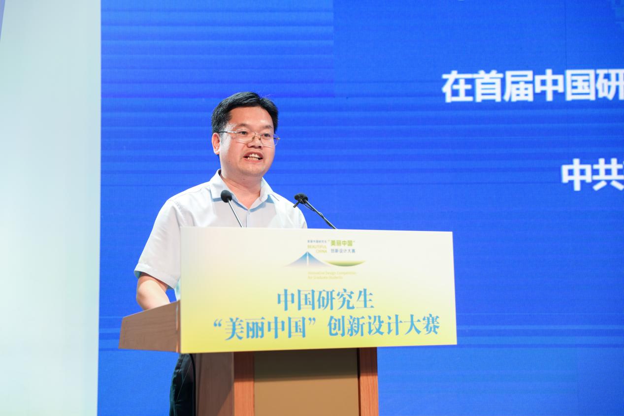 大赛专委会主任杨冬江进行了视频致辞,他表示设计是艺术学科中的重要领域,在实现中国式现代化的战略中承担着重要的历史使命,广大青年设计才俊通过艺术设计服务国家战略,以人民对美好生活的需求为导向,以创新为牵引,推进美丽中国发展,使命光荣,责任重大。希望广大有志于为建设美丽中国做出贡献的青年设计才俊积极加入大赛,通过实践淬炼美丽中国精神。