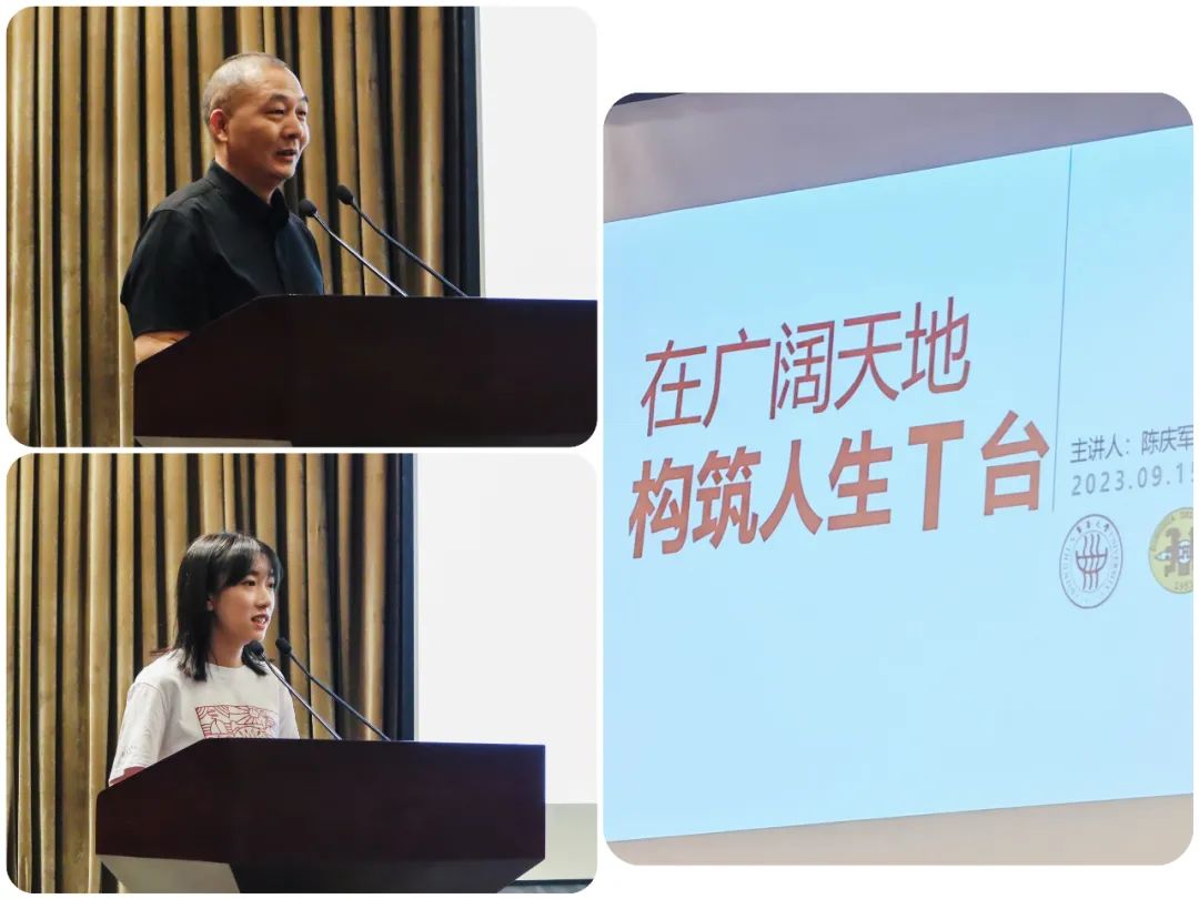 在迎新大会上,陈庆军老师为全体2023级新生带了有趣有料有深度的开学第一课《在广阔天地构筑人生T台》。“广阔天地,场景无限”,他引导同学们要在无限广阔的天地之间学习与实践;“时尚呈现,尚善尚美”,他引导同学们要坚守道德底线,以人民为设计之本;“T型结构,构筑T台”,他引导同学们要学习共处智慧,在综合广度与专业深度中寻求平衡。