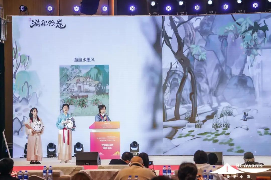 除“神仙打架”的分赛道路演外,现场还布置了有趣有料的设计作品展示区,与会人员既能根据作品“玩味梅城”地图导览手册“云游”严州,看到别具一格的“龙山书院诗人”IP形象,又可了解“茶花游园-之江花茶文化体验中心”等环境空间设计,还能看到将传统手工艺缠花与非纺织材料和鱼骨相结合的服装设计。“我们在比赛中不仅领略了建德厚重的历史文化,还结识了许多优秀研究生,期待一起共寻‘美丽中国’设计方案。”北京服装学院刘欣宇说到。