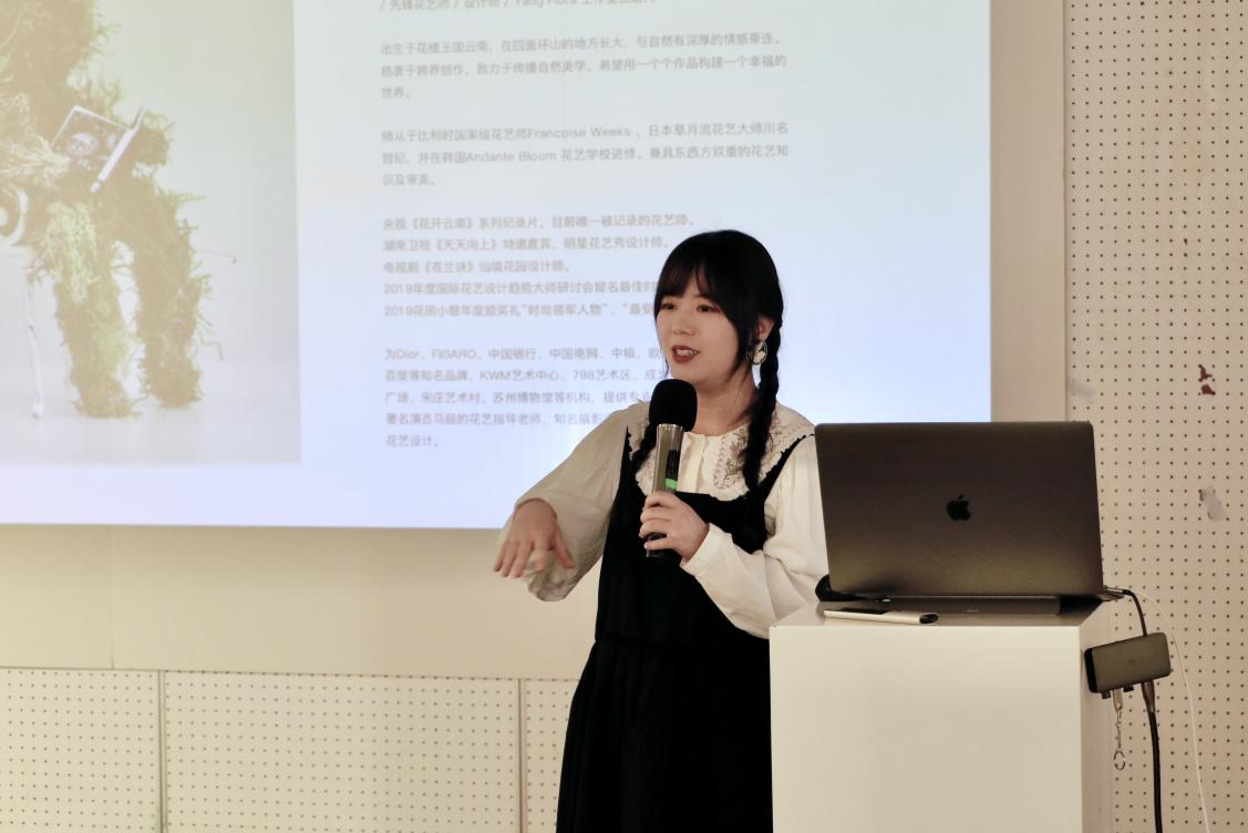 花植艺术家,YangFlora 创始人杨小玲分享的题目为“生命的对话:用花植艺术探索创造力”,她从与花植“恋爱”的视角讲述了当植物作为设计主角时的创作思维方式,总结出与植物“相互了解”、“介绍自我”、“深入对话”等阶段过程。