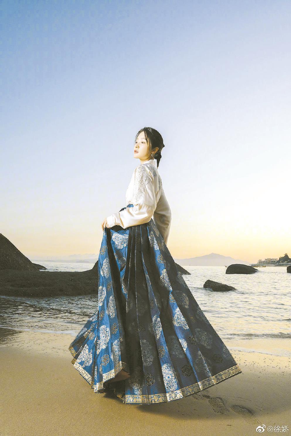 在“新中式”的流行趋势下,马面裙是消费者和生产者的共同选择。图为演员徐娇在个人微博上发布的马面裙穿搭。