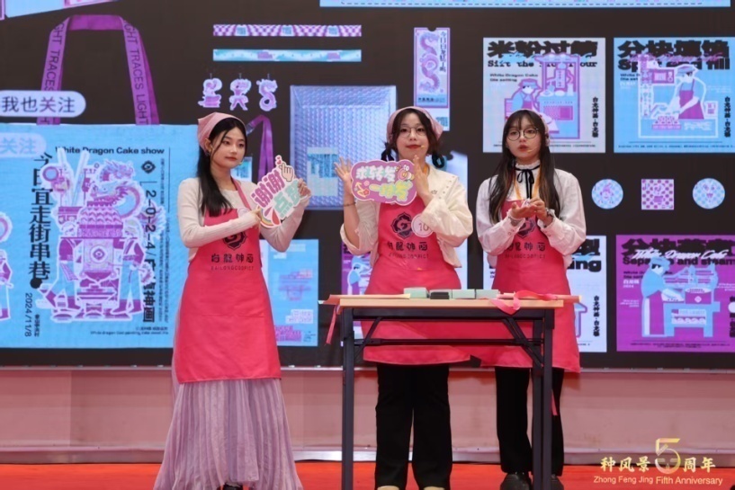 在乡村物产设计作品中,另一支我院学生团队以小白龙信俗为灵感、将农民画元素融入设计的《白龙神画——白龙糕品牌门店系列VI设计》,获得物产组一等奖,团队成员刘金津、何柔和周文慧感言:“我们把乡村非遗融入现代生活,‘以糕载道,以画传神’,打造一个沉浸式体验空间,是我们青年学生与乡村文化共鸣的缩影。”