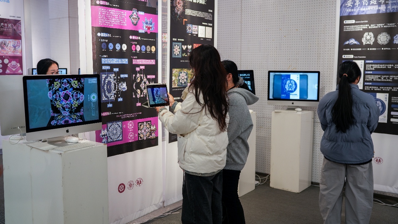 《数智织韵·非遗新生》非遗服饰文创与数字艺术联展同期在校举办,展出400余件具有代表性的传统织染绣面料和纹样样本,以及学员设计创作的服装服饰、文创产品等,把傣族织锦、阜阳刺绣、畲族服饰、上海药斑布印染、崇明土布编织等非遗技艺巧妙融入家居装饰、服饰箱包、国潮周边、IP形象等设计中,还有学员与企业进行合作或计划量产研培作品,实现文化传承的商业落地。